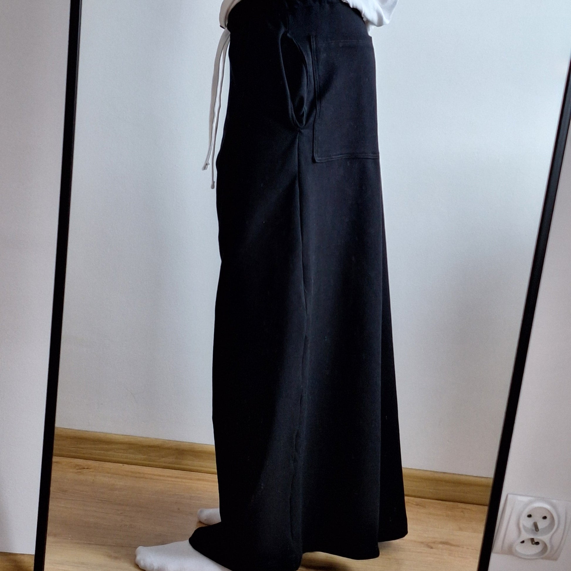 Elastyczny pas dopasowuje się do sylwetki, a szerokie nogawki gwarantują pełną swobodę ruchów oraz luźny, nowoczesny look.